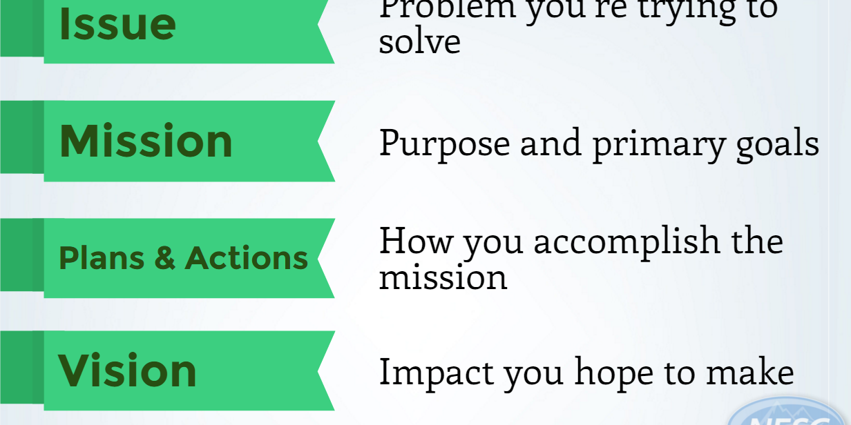 The mission is the purpose statement: why you exist; whom you serve; how you serve them. It is grounded in the community issue you are seeking to address.